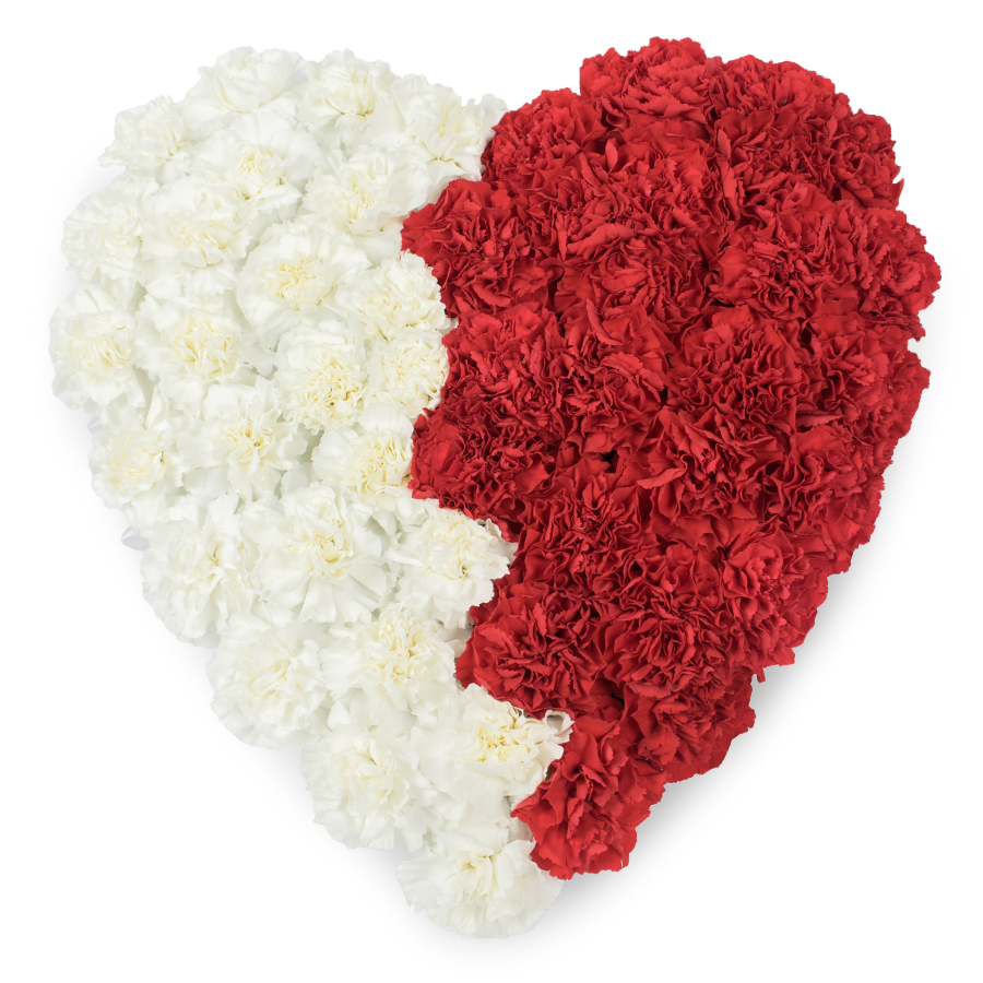 Discover the exquisite beauty of our heart-shaped bouquet, meticulously crafted with a vibrant mix of white and red carnations. Each flower is hand-selected to ensure exceptional freshness and superior quality.